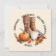 Celebrar o calor e a beleza do outono com este aconchegante cartão de saudação do outono, com botas, abóboras, uma xícara de café ou café de abóbora e folhas coloridas do outono. As palavras "Suéteres, Folhas Chateadas, Abóbora, Cabra, Cavaleiro, Hayrides, Burgões" capturam a magia da estação, fazer este perfeito para amantes do outono, reuniões de Ação de Graças, e outono.