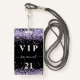Um crachá moderno, na moda e glamouroso para uma festa de aniversário 21 (ou qualquer idade). Um crachá moderno, na moda e glamouroso para uma festa de aniversário 21 (ou qualquer idade). Um fundo preto com poeira brilhante violeta e lavanda. Com o texto: VIP. Personalizar e adicionar nome, idade, endereço/data. O nome é escrito com um moderno estilo escrito à mão com traços. Para manter as hastes, exclua apenas o nome da amostra, deixe os espaços ou emoji na frente e depois do nome.