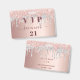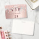 Um crachá moderno, na moda e glamouroso para uma festa de aniversário 21 (ou qualquer idade). Um fundo metálico rosa dourado falso com aspecto elegante, ouro rosa e brilho fino prateado, pintura pingando. O nome é escrito com um moderno e escuro, rosa dourado, escrito em estilo manuscrito, com traços. Com o texto: O número VIP 21 é gravado a uma cor de ouro. Para manter as hastes, exclua apenas o nome da amostra, deixe os espaços ou emoji na frente e depois do nome.