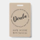 Um distintivo de nome de coração caprichoso de doula de bebê coach de parto com asas para eventos e feiras de parto.