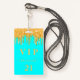 Um crachá moderno, na moda e glamouroso para uma festa de aniversário 21 (ou qualquer idade). Fundo de cor aqua com brilho sujo dourado, aspecto de pingar tinta. O nome é escrito com um moderno estilo escrito à mão com traços. Com o texto: O número VIP 21 é gravado a uma cor de ouro. Para manter as hastes, exclua apenas o nome da amostra, deixe os espaços ou emoji na frente e depois do nome.