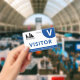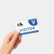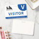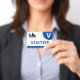 Crachá de visitante horizontal com um simples design em branco e azul. Um V branco grande facilita o reconhecimento rápido do visitante. Personalize com o logotipo da sua empresa.