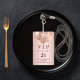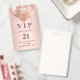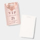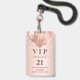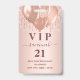 Um crachá moderno, elegante e glamoroso para uma festa de aniversário de 21 anos (ou qualquer idade). Um fundo gradiente em rosa dourado com gotas de brilho falso e efeito de tinta pingando. Com o texto: VIP. Personalize e adicione nome, idade, endereço/data. O nome é escrito com uma fonte manuscrita moderna em cor rosa dourado escuro com floreios.