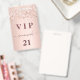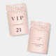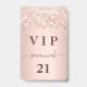 Um crachá moderno, elegante e glamoroso para uma festa de aniversário de 21 anos (ou qualquer idade). Um fundo de rose gold com confetes em rose gold. Com o texto: VIP. Personalize e adicione nome, idade, endereço/data. O nome é escrito com uma fonte manuscrita moderna em rose gold escuro com floreios.