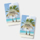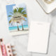 Uma etiqueta com uma fotografia linda e tranquila de 2 palmeiras sob um céu azul brilhante.