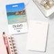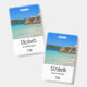 Crachá personalizado com fotografia de uma praia azul-oceânica turquesa com rochas grandes espalhadas ao longo da costa. Local tropical brilhante e ensolarado.