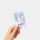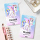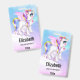 Crachá personalizado com a imagem de um unicórnio com grandes olhos azuis, asas cor-de-rosa e um arco-íris e cauda. Kawaii fofo.