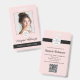 Blush pink and black employee badge with modern typography and elegant script includes a photo, qr code and add your own logo. Quickly send clients to reviews pages, price lists or landing pages with a qr code on your badges. Message the designer for further customization.