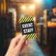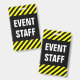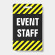 Este design de crachá apresenta um padrão listrado preto e amarelo, juntamente com a mensagem "PESSOAL DO EVENTO" em texto negrito. Poderia ser usado para identificar pessoas que trabalham para os organizadores de um evento.