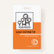 Uma coluna branca e laranja bloqueia o design é realçada por uma faixa branca perto do centro do crachá. Perto do topo do crachá há um modelo de foto para carregar fotos com tamanho de 1.000 x 1.000 pix. Abaixo deste modelo de foto está o seu nome com o título do trabalho. Para sul, na direção da base, está o logotipo global branco opcional que você pode usar e seu contato com o URL do e-mail.