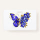 Borboleta de flores cinza, azul, safira, espumante com asa decorada com flores preciosos azuis com folhas de ouro sobre fundo branco.