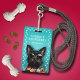 Um lindo schnauzer preto em turquesa brilhante com uma borda de impressão de pata branca, este crachá de identificação de negócio de salsicha para cães é uma maneira divertida de identificar nossa equipe.
