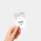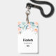 Crachá personalizado com uma elegante borda floral. Flores e folhas cor-de-rosa e verde.