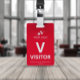 Crachá de visitante vertical com um simples design de branco contra fundo vermelho. Um V branco grande facilita o reconhecimento rápido do visitante como tal. Personalize com o logotipo da sua empresa.