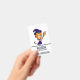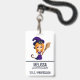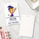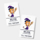 Nomeie crachá com uma bruxa fofa vestindo um chapéu de bruxa roxa. Seu gato preto descansando em cima da cabeça. Ela tem cabelo laranja longo e é carregando vassoura. Ótima ilustração de desenho animado perfeita para halloween.