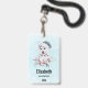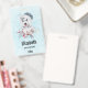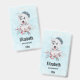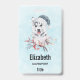Crachá personalizado com uma pintura de aquarela branca e fofa de um cão rouco vestindo um chapéu azul de Papai Noel.