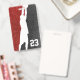 Vermelho rubi e preto falso brilhante atrás de um contorno branco ousado de um jogador de basquete. Atualize facilmente o número da camisa na frente e personalize as informações no verso. Disponível em outras cores de time cintilantes.