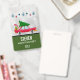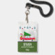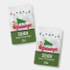Crachá com um carregando legal e velho de carro vermelho, um pinheiro verde de natal no telhado e um presente preso no tronco aberto. Tem um belo estilo de anos 50 retrógrados. Bolas de Natal, flocos de neve e estrelas penduradas no topo. Colocado sobre um fundo prateado com estrelas na moda espalhadas por aí. Fronteira verde florestal colorida ao longo da base com seu nome personalizado e dentro de título.