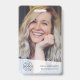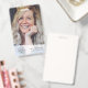 Crachá de ID corporativo simples e na moda, que pode ser facilmente personalizado com a foto, o nome, a posição, o logotipo da empresa, os detalhes comerciais e o código QR ou código de barras do seu funcionário. O design na moda apresenta uma tipografia moderna minimalista e uma faixa transparente. A imagem mostrada é apenas para fins de ilustração para ser substituída pela sua própria foto. A imagem de marcador de posição é de uma mulher feliz com cabelo branco ondulado.