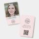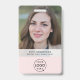 Crachá simples, cor-de-rosa, cor-de-rosa, para identificação corporativa, que pode ser facilmente personalizado com a foto, o nome, a posição, o logotipo da empresa, os detalhes comerciais e o código QR ou código de barras do seu funcionário. O design na moda apresenta uma tipografia moderna minimalista e uma faixa transparente. A imagem mostrada é apenas para fins de ilustração para ser substituída pela sua própria foto. A imagem de marcador de posição é de uma jovem mulher numa jaqueta marrom com cabelo comprido.