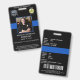 Identifique-se facilmente a si mesmo e ao seu policial no departamento de polícia com estes crachás personalizados de fotografia, logotipo, código de bar, cartão de identificação da polícia com a bandeira azul fina. Personalize com foto do policial, nome, número do crachá, detalhes e departamento de polícia. Personalize com o logotipo, o selo e o código de barras da sua delegacia. Este crachá de cartão de identificação policial de linha azul é perfeito para todos os policiais, polícias, sargento, chefe, capitão e tenente. COPYRIGHT © 2020 Judy Burrows, Black Dog Art - Todos Os Direitos Reservados. Crachá de Cartão de Identificação de Polícia de Polícia Profissional