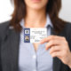 Um crachá horizontal azul escuro fosco forma uma borda à esquerda deste cartão e tem um modelo para o seu logotipo e foto do funcionário. A frente direita e o verso do cartão têm modelos para o nome da sua empresa; detalhes do funcionário e endereço comercial. Personalize o modelo de acordo com as suas necessidades e altere a cor do fundo e da fonte para qualquer uma de sua escolha.