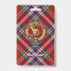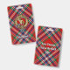 Crachá da crista Clan MacFarlane rodeado por uma pulseira e fivela sobre fundo de tartã vermelho. Custom Text.