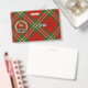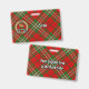 Crachá da crista Clan Scott rodeado por uma correia e fivela sobre fundo vermelho-tartano. Texto personalizado de ambos os lados.