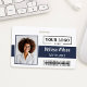 Dê à sua empresa uma aparência polida e moderna com este design crachá horizontal. O layout é definido por uma estética geométrica limpa, usando uma estrutura de blocos azul branca e marinho para organizar de forma inteligente a foto, o nome e o título de um funcionário. Um espaço designado para um logotipo completa o design, criando um acessório sofisticado e profissional para qualquer local de trabalho ou evento.