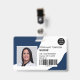 Um crachá de foto de enfermeira azul-marinho moderno e profissional, com layout horizontal de logotipo e código de barras.