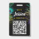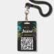 Cordão com código QR para comprar uma bebida para a aniversariante. Peça a todos os convidados da festa de aniversário que usem esses cordões para obter bebidas grátis! Este design deslumbrante inclui penas de pavão cintilantes com uma máscara festiva do Mardi Gras.