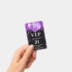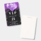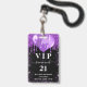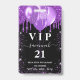 Um crachá moderno, elegante e glamoroso para uma festa de aniversário de 21 anos (ou qualquer idade). Fundo preto com respingos de purpurina falsa roxa, efeito de tinta pingando e balões. Com o texto: VIP. Personalize e adicione nome, idade, endereço/data. O nome é escrito com uma fonte manuscrita moderna em cor dourada rosa escuro com floreios.