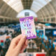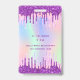 Para uma festa de Sweet 16, 16 anos (ou qualquer idade). Um fundo holográfico moderno em cores pastel de arco-íris em rosa, roxo, dourado rosa, verde menta. Decorado com gotas de brilho falso, visual de tinta pingando. Personalize e adicione um nome e idade 16. Letras roxas. Parte de trás: detalhes da sua festa.