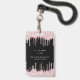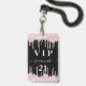 Um distintivo moderno, elegante e glamoroso para uma festa de aniversário de 21 anos (ou de qualquer idade). Fundo preto com efeito de brilho falso rosa e aspecto de tinta pingando. Personalize e adicione um nome. O nome é escrito com uma fonte moderna manuscrita e floreios. O texto: VIP Número 21 é escrito em cor rosa. Para manter os floreios, apenas exclua o nome da amostra, deixando os espaços ou emojis antes e depois do nome.