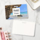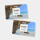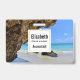 Etiqueta com uma fotografia de natureza cênica. Belo mar azul-turquesa com uma praia de areia. Uma grande rocha marrom fornece alguma sombra do céu azul brilhante.