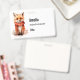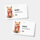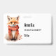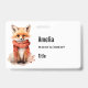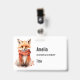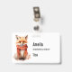 Name badge with an illustration of a reddish orange fox pup. A subtle smile on his face. Wearing a nice red scarf for warmth.