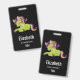 Crachá personalizado com uma imagem de um unicórnio estilo Frankenstein. Cor roxa e verde. Muito fofo.