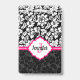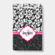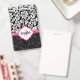 Damasco floral branco e preto elegante e sotaque cor-de-rosa. Monograma personalizado