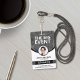 Um crachá de identificação moderno para convidados de conferência e eventos, vip, auto-falantes ou funcionarios. A design mostra a fotografia das pessoas, bem como o nome e a ocupação das pessoas. A designação das pessoas é apresentada em letras brancas sobre fundo colorido. O crachá moderno de ID de conferência pode ser personalizado com uma foto de fundo adequada por trás do título do evento, se desejar. O verso deste crachá de ID é vazio e está aberto para que você adicione mais informações, como um código de bar ou detalhes dos patrocinadores de eventos. As cores podem ser personalizadas para corresponder ao esquema de cores da sua empresa. Versão preta.
