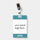Personalize este simples crachá de equipe de voluntários para eventos modernos com o seu logotipo. Se o seu logotipo for quadrado, ele preencherá todo o espaço branco. Se o seu logotipo não for quadrado, ele será exibido em um fundo azul-turquesa. A parte de trás do crachá pode ser personalizada com o nome e data ou ano do evento, ou você pode excluir ambos para ter uma textura azul-turquesa de efeito pintado. Este crachá de equipe minimalista é ideal para eventos especiais, festivais, concertos e convenções.