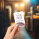 Um crachá VIP moderno na moda para um evento com uma seção transversal de geodo de ametista roxo. Adicione o nome do evento.