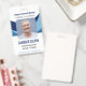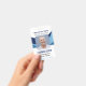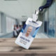 Crachá de identificação de funcionário azul, azul-marinho e branco com formas em três tons de azul. Crachá de identificação do funcionário personalizado com nome, cargo, número de identificação e um código de barras no verso.