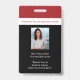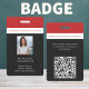 Um crachá profissional de funcionário para professores, educadores e funcionários do campus escolar. Funciona para todos os tipos de escolas: particulares, públicas, pré-escolares, primárias, secundárias e superiores. Tema de cores moderno em vermelho, branco e preto. Adicione a foto do funcionário, cargo e lema ou credo da escola. O usuário tem a opção de adicionar um código QR.