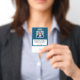 Na frente, personalize a foto, o nome, o cargo, o ID# e adicione o logotipo da sua empresa.