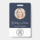 Crachá de identificação azul profissional moderno com a foto do seu funcionário em uma moldura circular, o nome dele em um script branco elegante e o cargo em letras brancas simples, e o logotipo da sua empresa. No verso, adicione informações adicionais e códigos QR e barras opcionais.