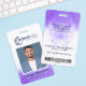 crachá de ID de funcionário com design geométrico roxo, posicionamento de fotos, código de barras e área de logotipo da empresa. Personalize com o nome do funcionário, o título do cargo e as informações de contato. Ideal para escritórios, iniciações, equipes remotas e ambientes profissionais de trabalho. Limpo, moderno e fácil de personalizar.
