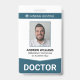 Um crachá moderno de identificação para hospitais, clínicas e instalações médicas. O modelo de ID do crachá de funcionarios médico inclui uma foto de ID do seu funcionário, o nome e profissão do funcionário, bem como um número de ID do crachá. O nome do grupo definido como "doutor" é exibido proeminentemente na parte inferior com uma seta como design apontando-a para fora. A parte traseira do crachá de ID de funcionarios do hospital é intencionalmente deixada vazio e aberta para que você adicione mais informações sobre o funcionário e o hospital ou clínica. Cor: Marinho