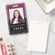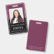 Um crachá de imprensa fotográfica moderno com o nome em vermelho burgundy. .Basta adicionar sua foto e informações. Esta versão vem com um pátio, mas você pode escolher seu estilo de fixação que inclui, jardim, clipe de metal ou retrátil, ou nenhum anexo.