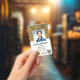 Faça upload facilmente do seu próprio logotipo, foto, código QR ou código de barras. Destaque-se da multidão com um glitter divertido e alegre nos crachás de identificação da sua equipe. O texto extra diz "Totalmente Vacinado". O modelo editável inclui nome, cargo, qualificação, data de emissão e validade. Crachá de identificação com foto em glitter dourado com código de barras QR. Veja nossa coleção para mais ideias de crachás de identificação com foto.