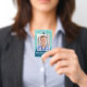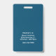 Cartão de identificação azul e branco personalizável para funcionários. Crachá de identificação profissional pode ser completamente personalizado, incluindo foto, nome, cargo na frente, bem como todo o texto no verso.